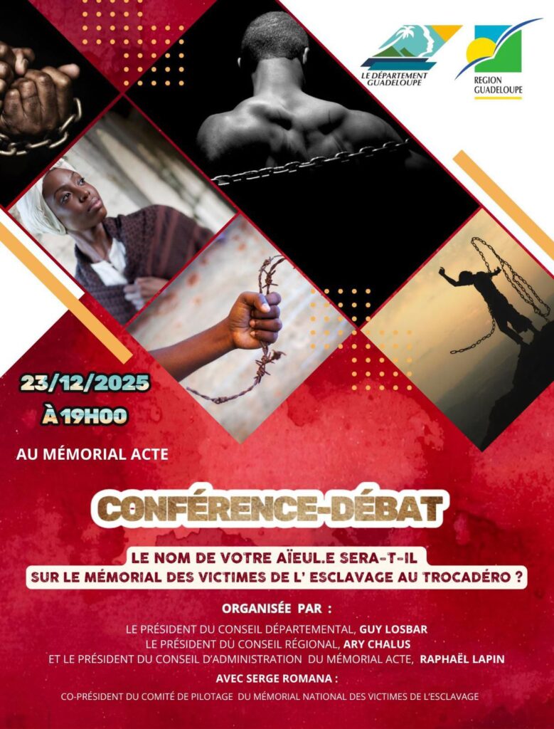 Le Département Guadeloupe, en partenariat avec le Conseil régional et le MACTe, a organisé une conférence-débat le 23 décembre 2025 à 19h au MACTe, animée par Serge Romana, co-président du comité de pilotage du Mémorial national des victimes de l’esclavage.